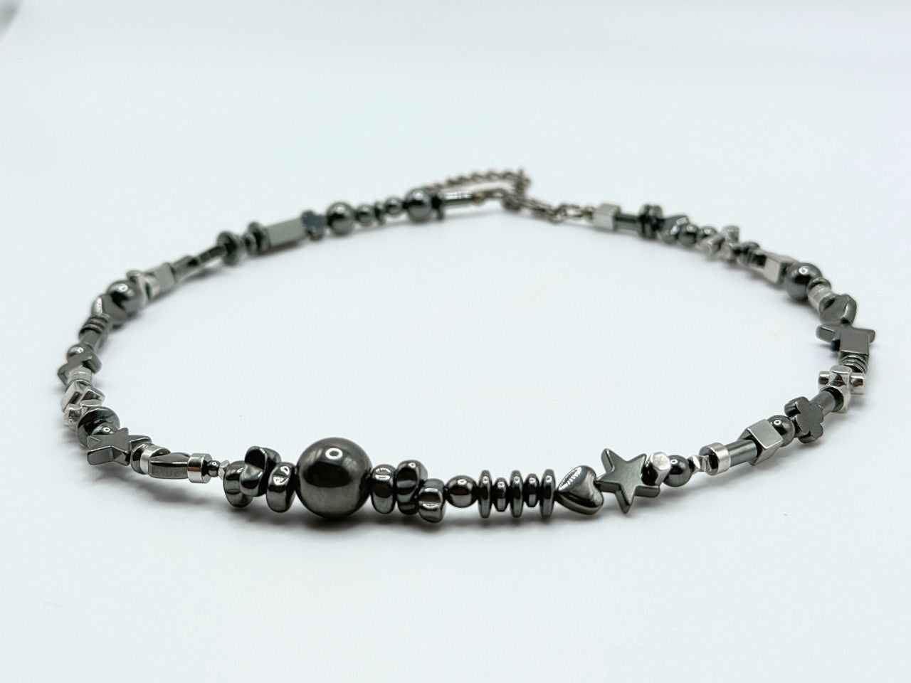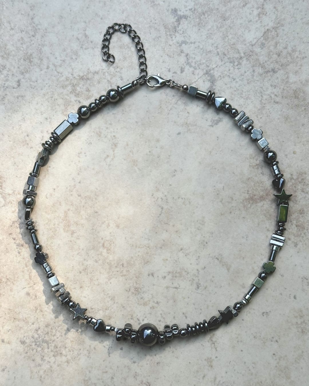 Transformation is never neat, and neither is this chain. Ego Death is strung with an unpredictable mix of hematite beads, each shape and size a reflection of dismantling what once felt fixed. No symmetry, no perfection, just raw pieces of iron-bound grounding. This is transformation in motion: chaotic, magnetic, and beautifully unrepeatable. Wear it as a reminder that dissolving the old self is the first step to building the truest one.