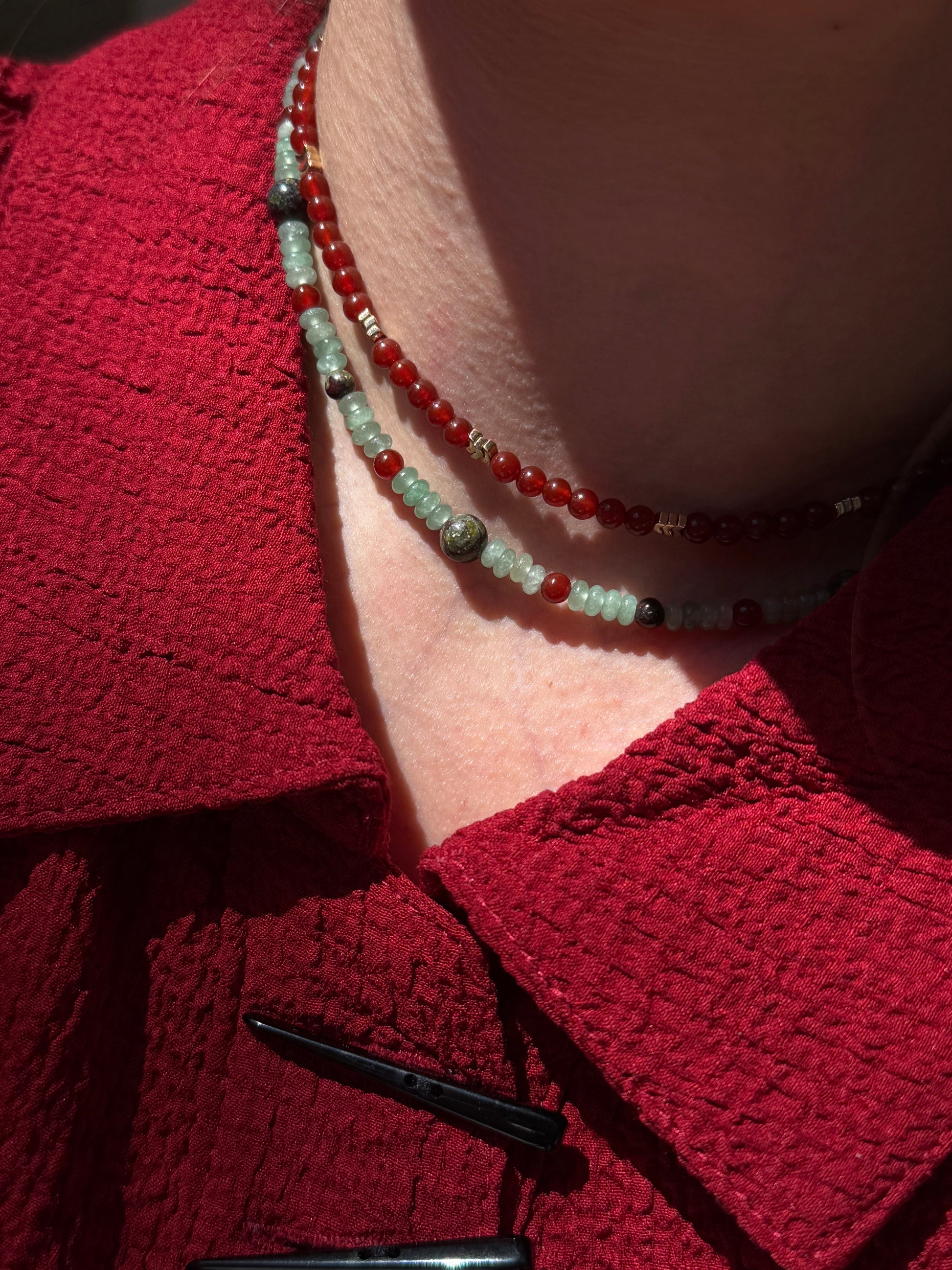 Avoid water, chemicals, and pressure. Store in a dry place. If your necklace becomes dirty, gently wipe with a soft, dry cloth. Cleanse with moonlight, sound, or intention — skip saltwater. Treat it like the ritual it is.