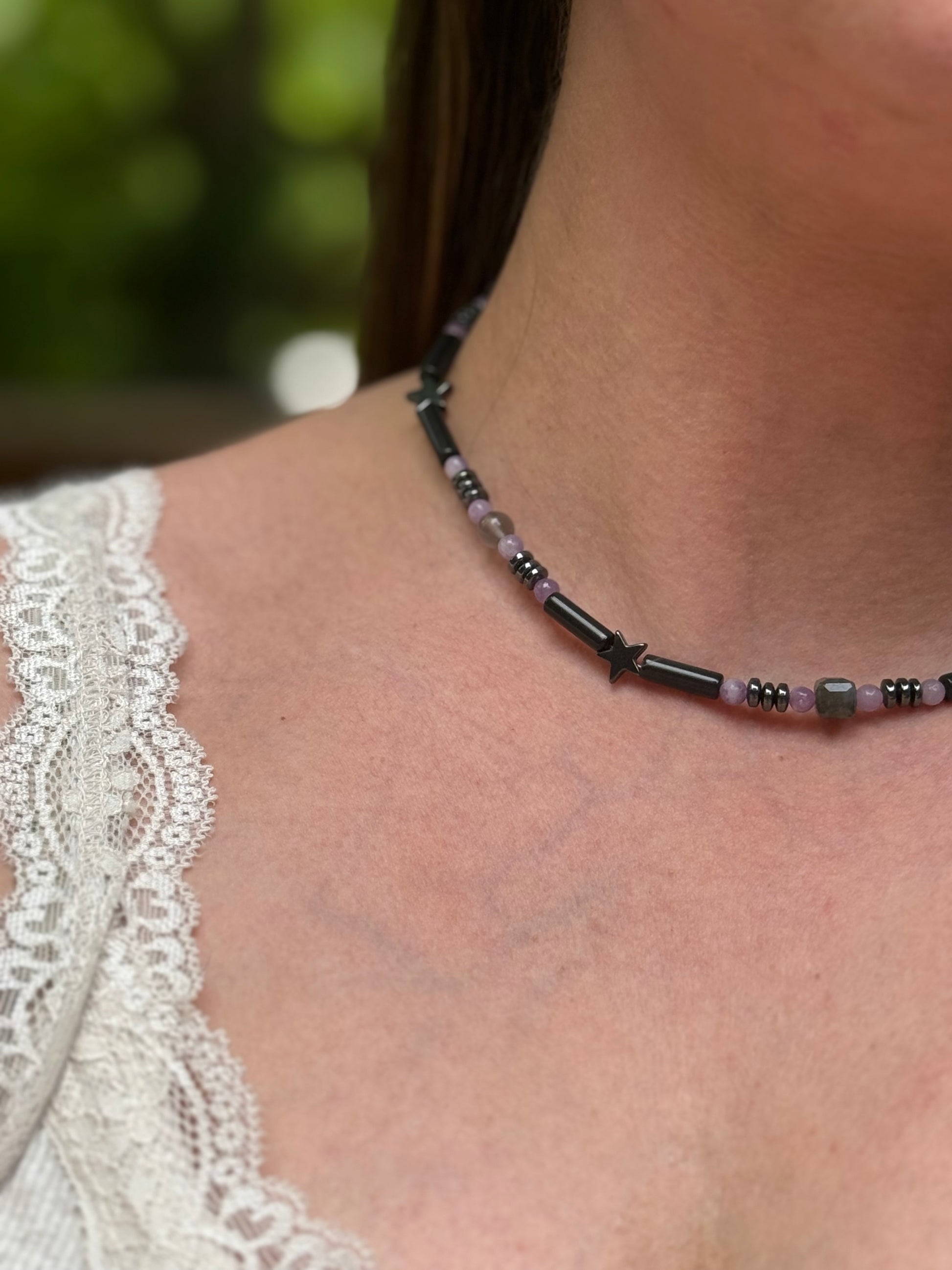 Avoid water, chemicals, and pressure. Store in a dry place. If your necklace becomes dirty, gently wipe with a soft, dry cloth. Cleanse with moonlight, sound, or intention — skip saltwater. Treat it like the ritual it is.